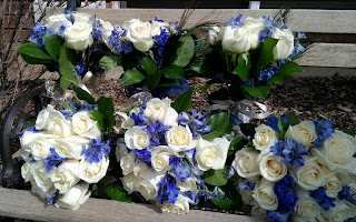 I had a few extra blue delphinium left over and found a gold vase and made this arrangement up as an extra for the bride!